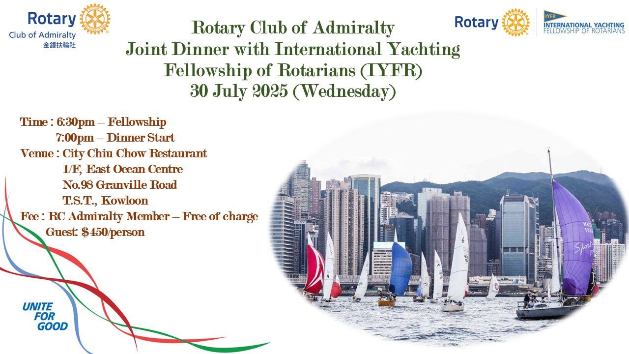 Rotary Club of Admiralty is pleased to announce a joint dinner with the International Yachting Fellowship of Rotarians (IYFR)!