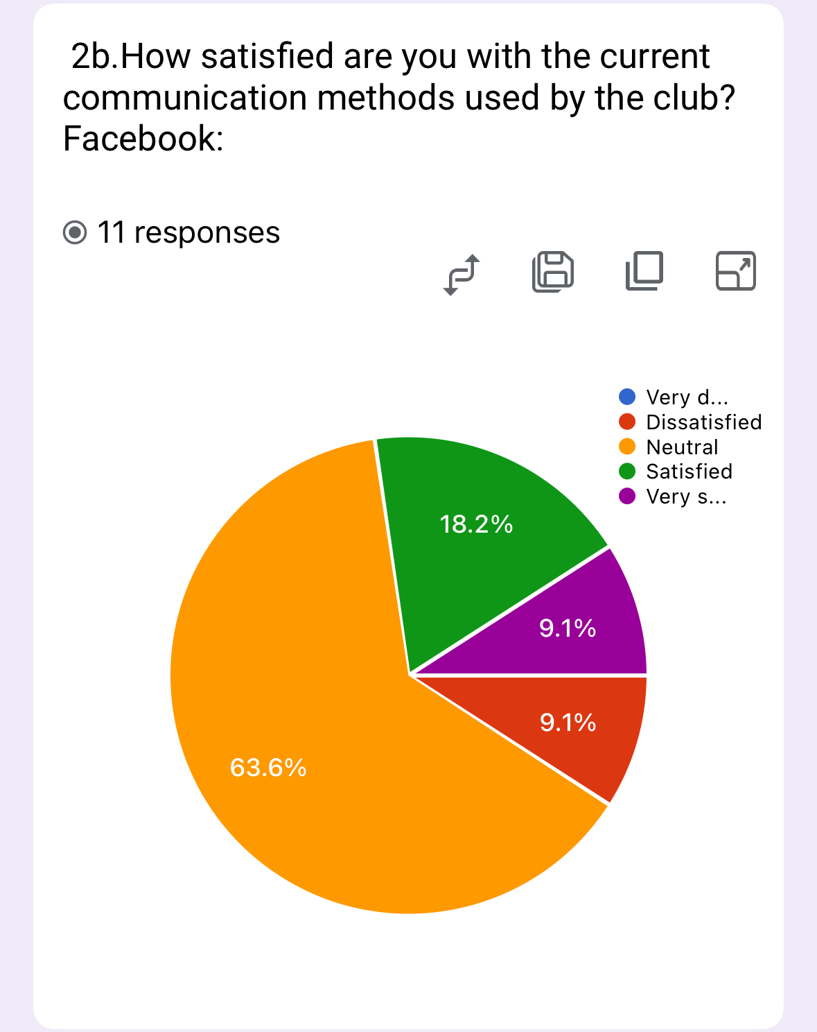 The survey reveals Facebook communications are meeting basic needs (63.6% neutral), but failing to excite members (only 9.1% very satisfied). The 9.1% dissatisfaction rate suggests room for improvement.