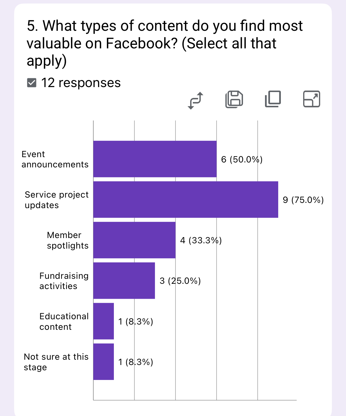 The survey shows service project updates (75%) and event announcements (50%) are most valued, while member spotlights (33.3%) and fundraising content (25%) are less popular. Educational content ranks lowest (8.3%).