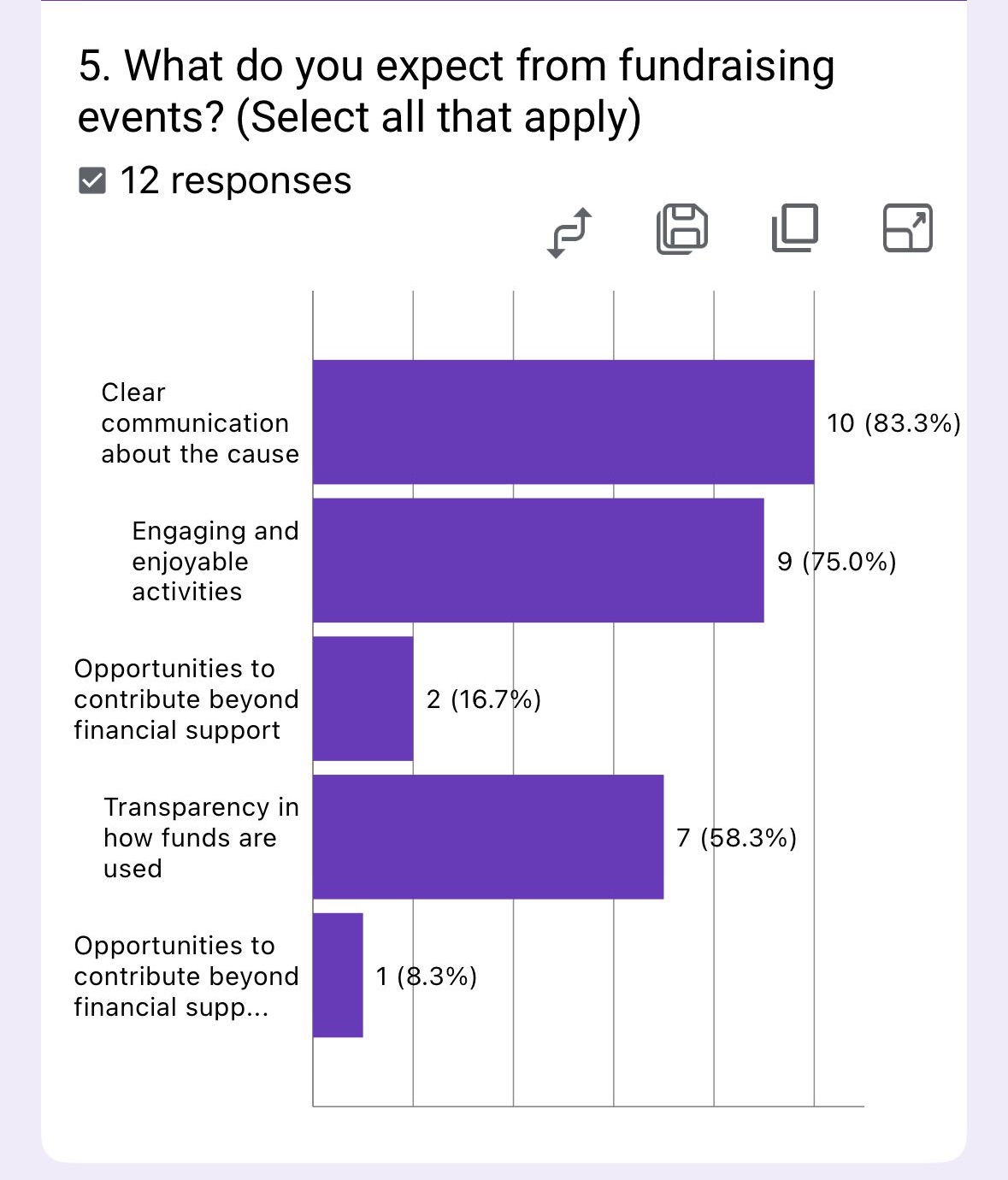 Survey results from 12 members show clear priorities for fundraising events: 83.3% value clear communication about the cause, while 75.0% want engaging activities. Transparency in fund usage is important to 58.3%, but non-financial contribution opportunities rank low (16.7%). Recommendations: