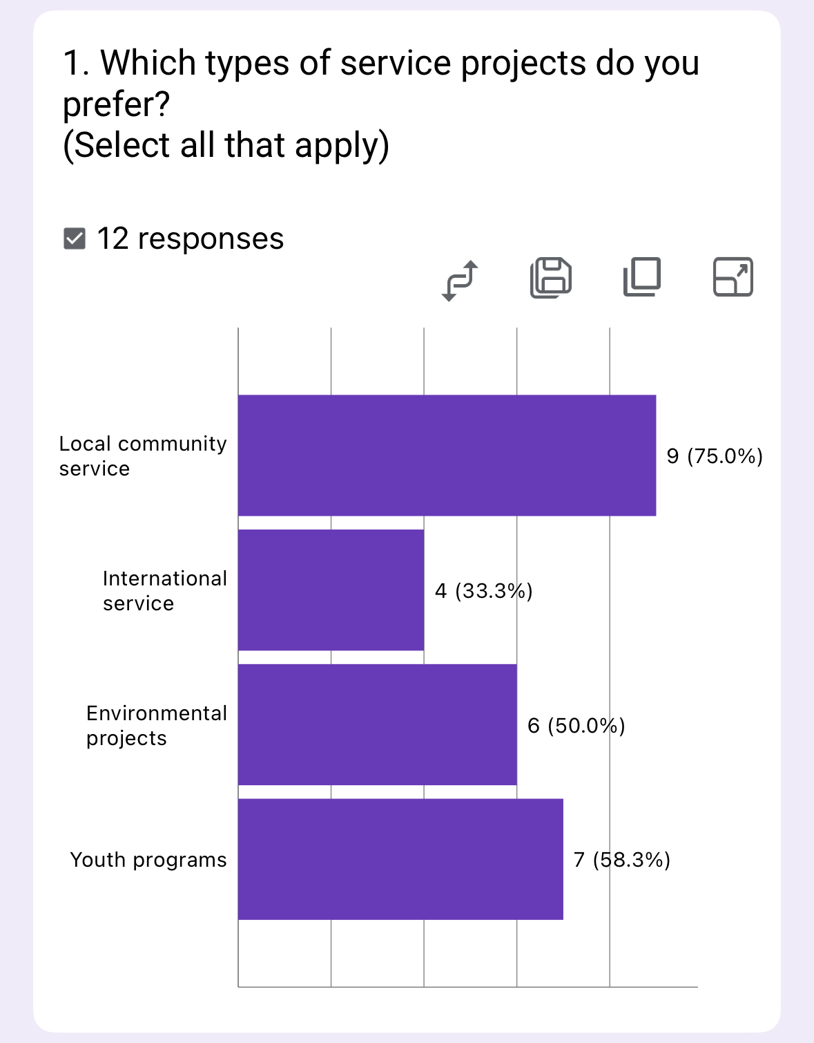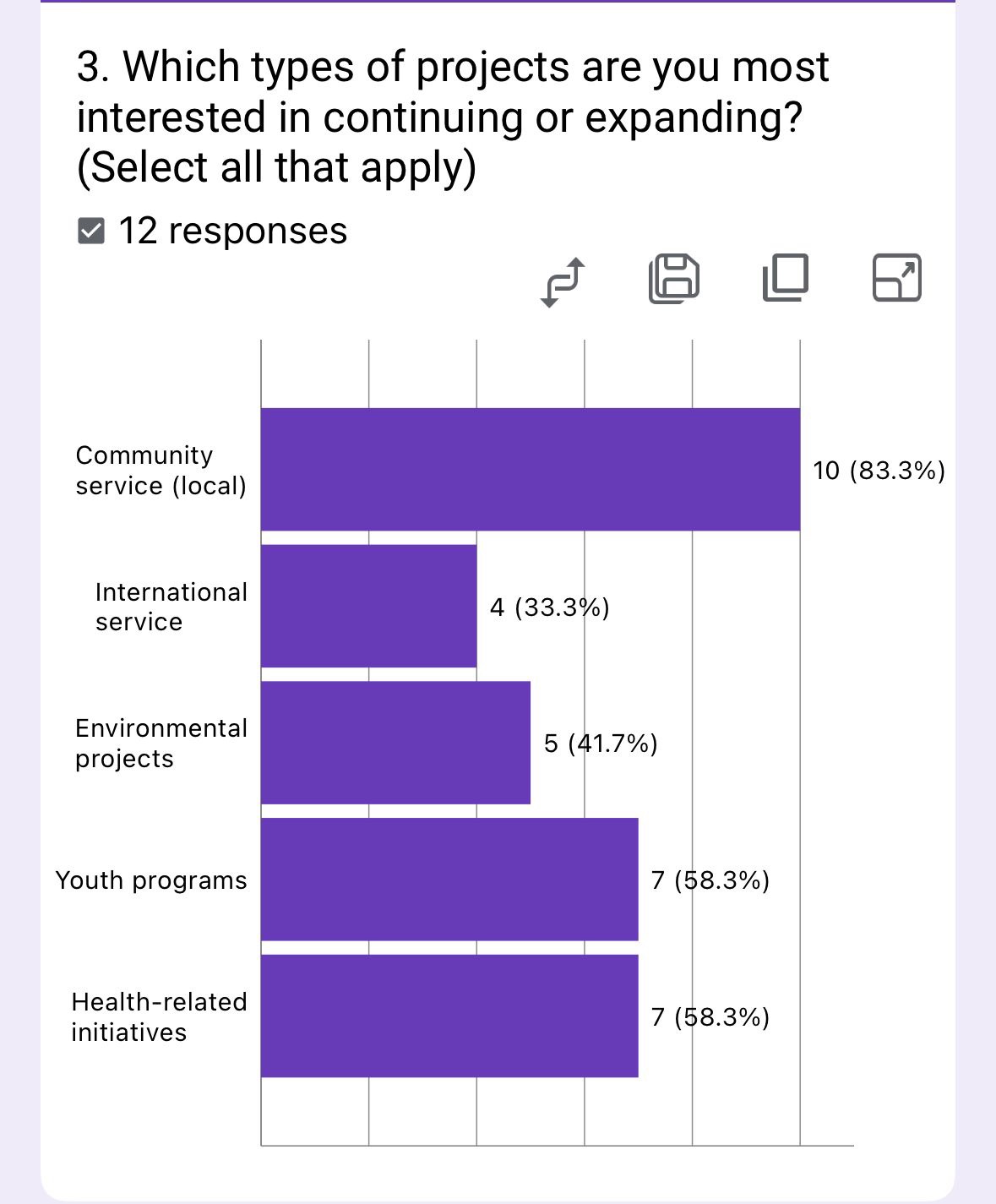 The survey shows strong preference for local community service (75%) and youth programs (58.3%), with moderate interest in environmental projects (50%) and less in international service (33.3%).