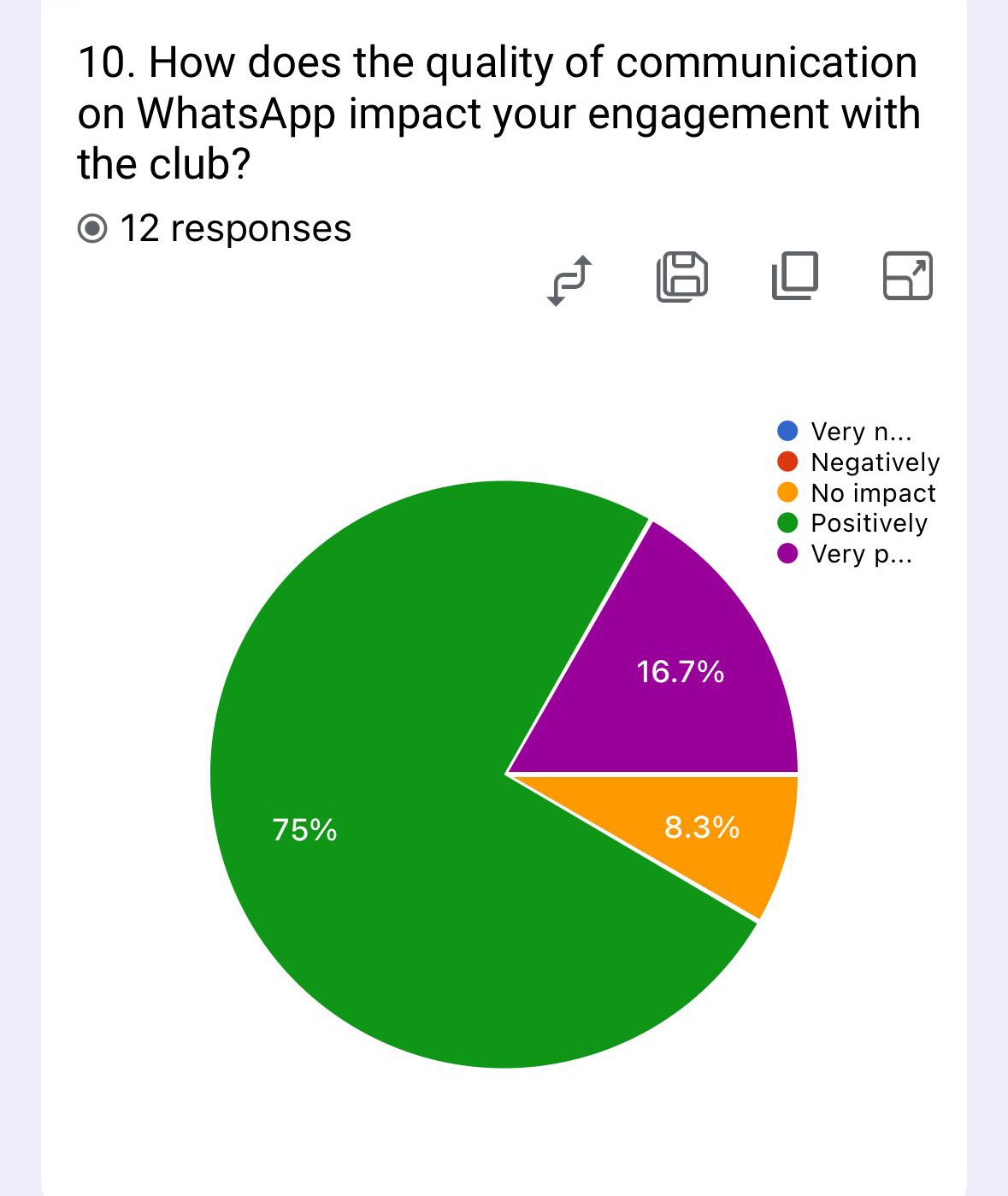 The survey reveals WhatsApp strongly supports engagement, with 75% reporting positive impacts and 16.7% very positive effects. Only 8.3% experience low impact.