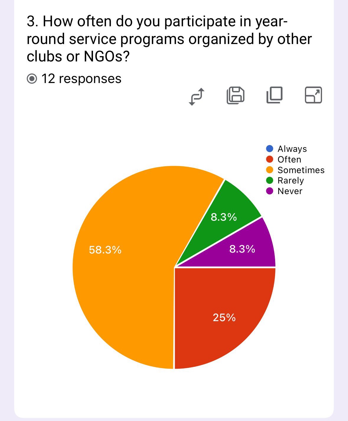 The survey shows moderate external service engagement, with 58.3% participating sometimes and 25% often. Only 8.3% rarely or never join external programs.