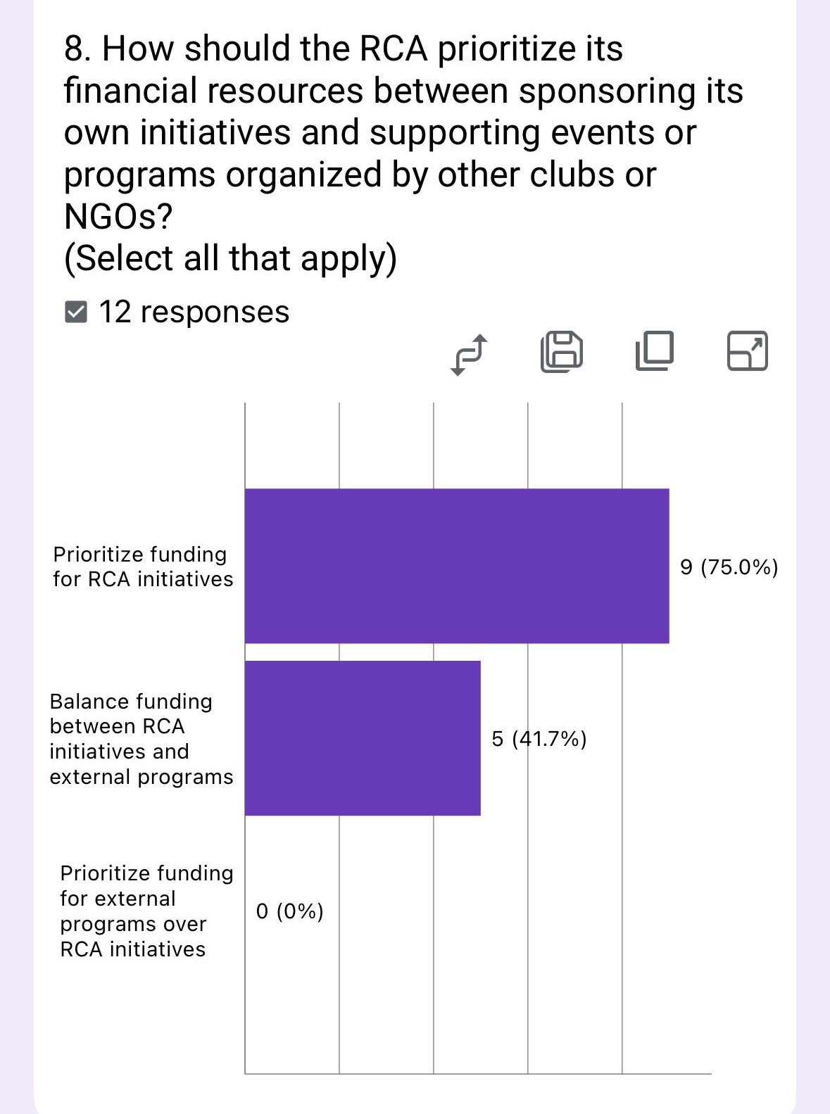 The survey reveals strong support for prioritizing RCA initiatives (75%), with a significant minority (41.7%) advocating for balanced funding. No members supported prioritizing external programs over internal ones.