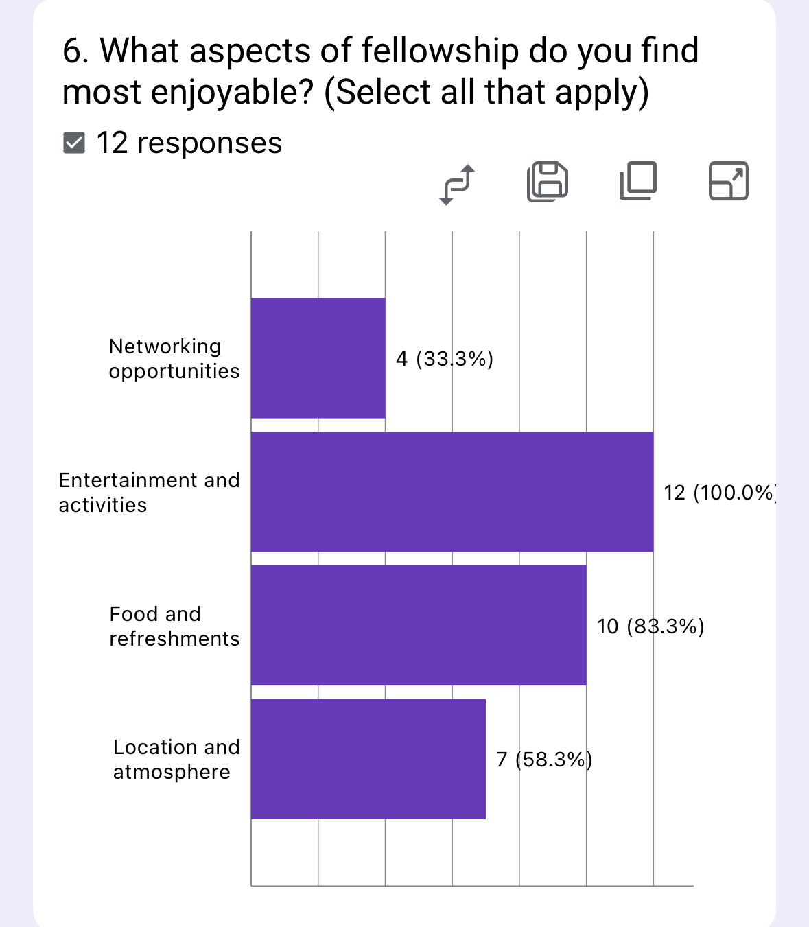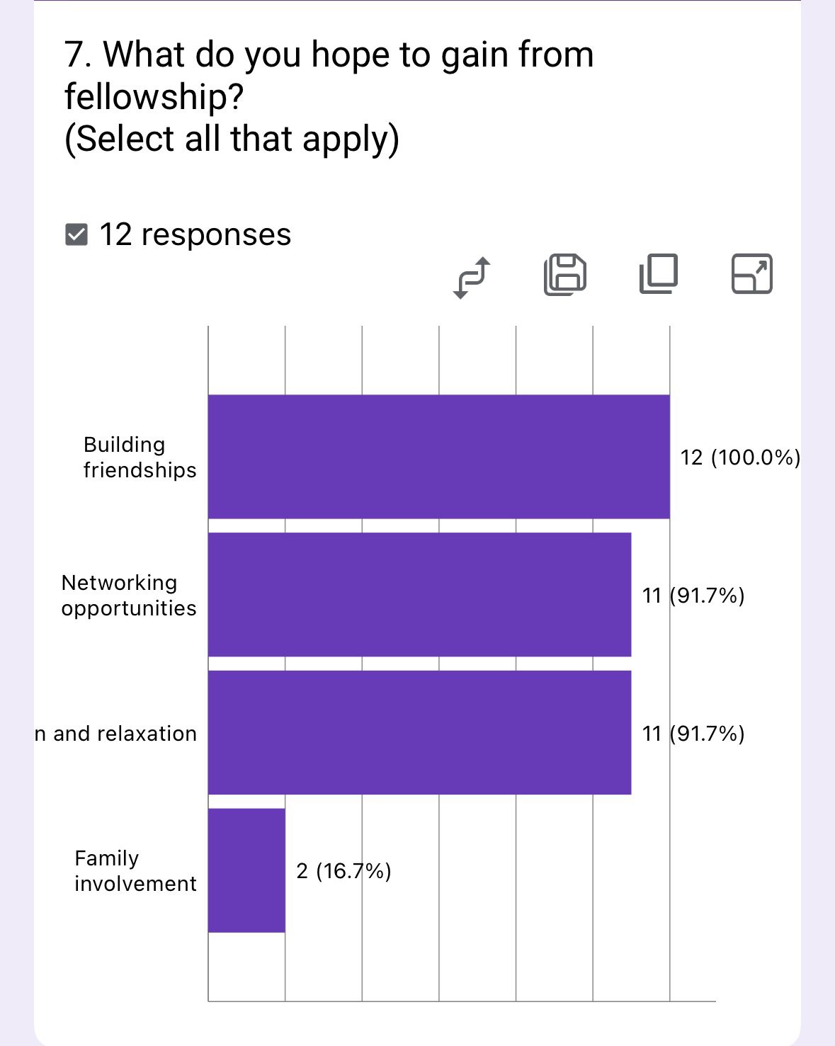 The survey of 12 members reveals overwhelming emphasis on social connections, with 91.7% seeking both friendships and networking opportunities through fellowship. Family involvement was significantly less prioritized (16.7%).