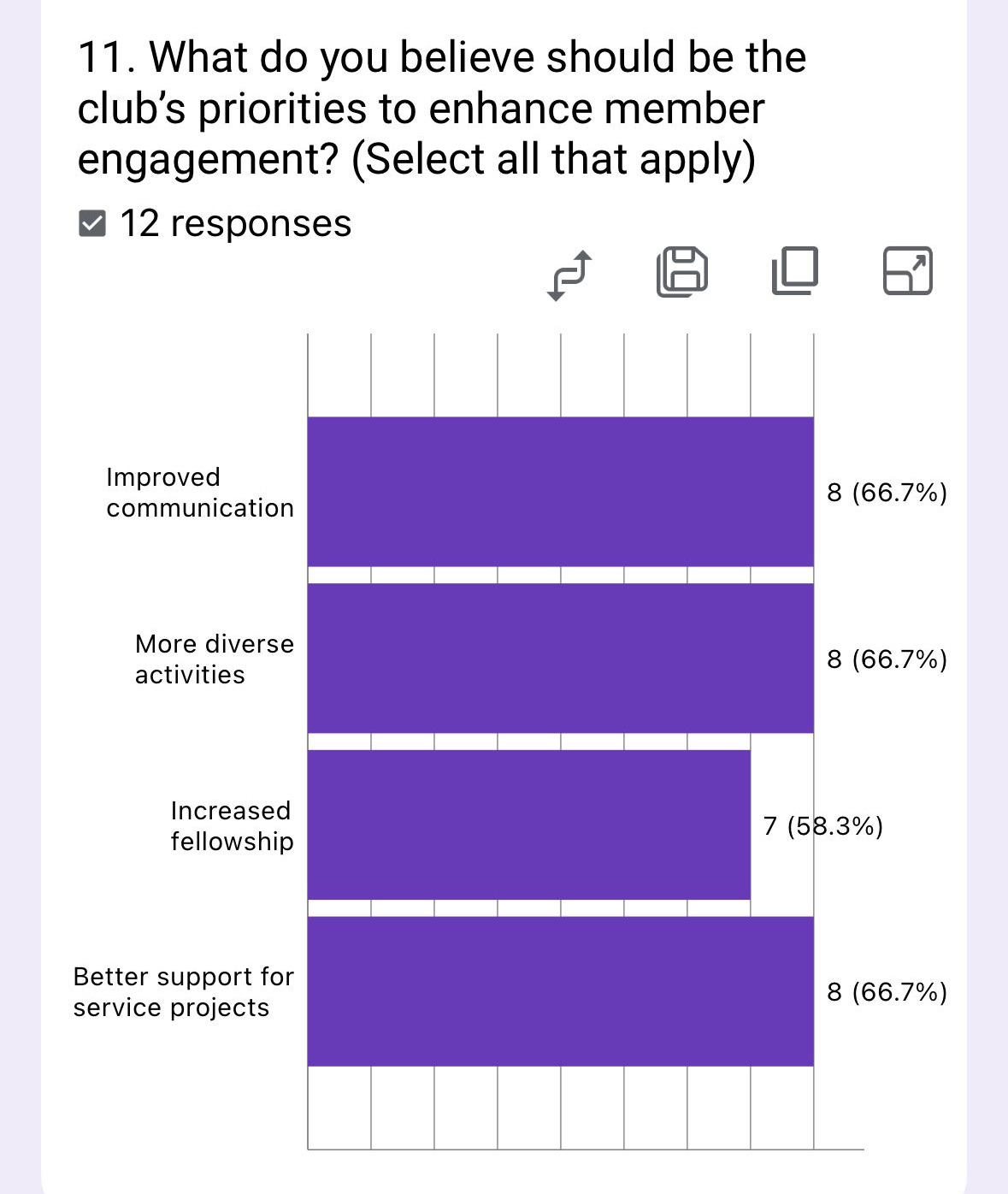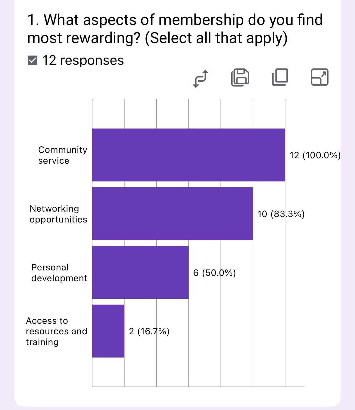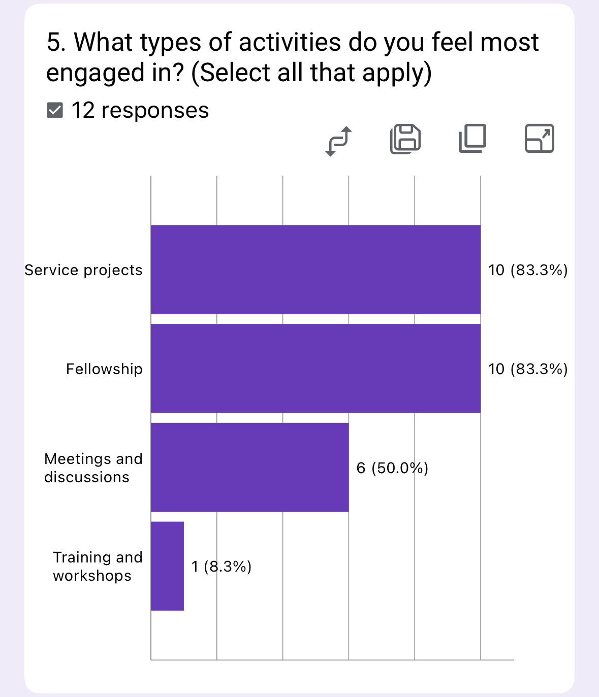 The survey highlights strong engagement with service projects and fellowship (83.3% each), while meetings (50%) and training (8.3%) lag significantly. This suggests members prefer active, purpose-driven experiences over passive learning.