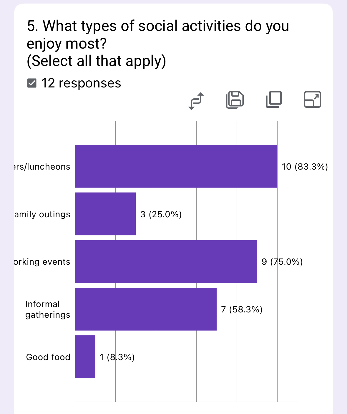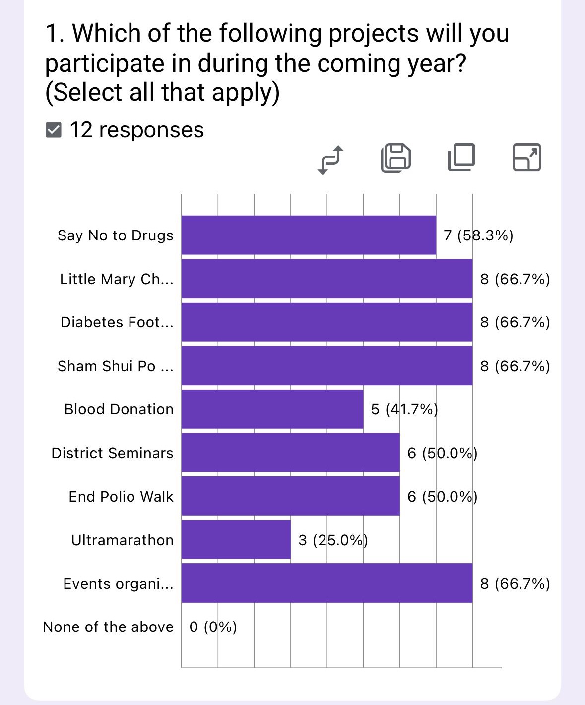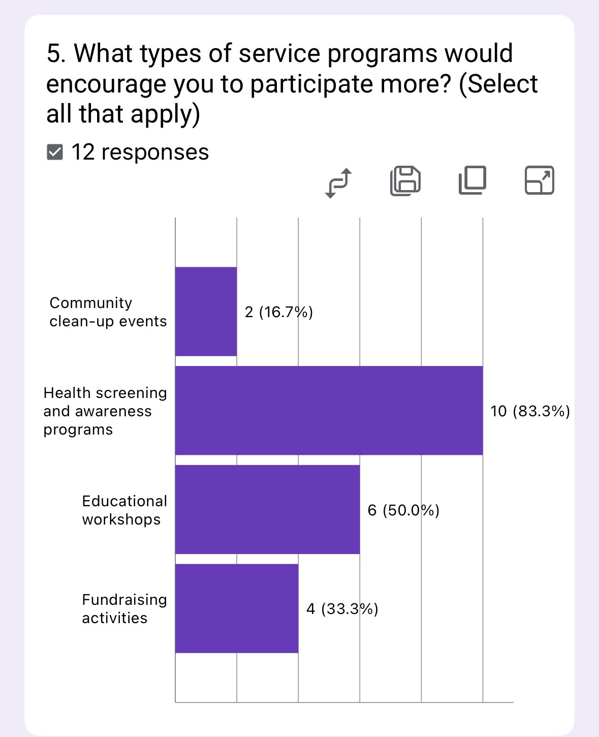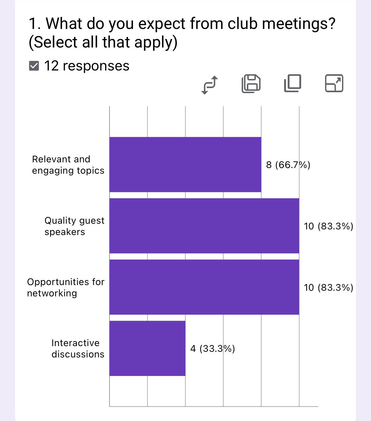 The survey highlights strong engagement with service projects and fellowship (83.3% each), while meetings (50%) and training (8.3%) lag significantly. This suggests members prefer active, purpose-driven experiences over passive learning.