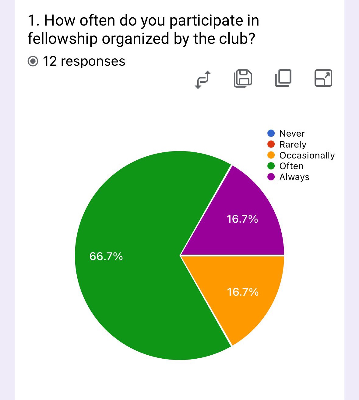 The survey shows varied participation levels: 66.7% participate often, while 16.7% each participate occasionally or always.