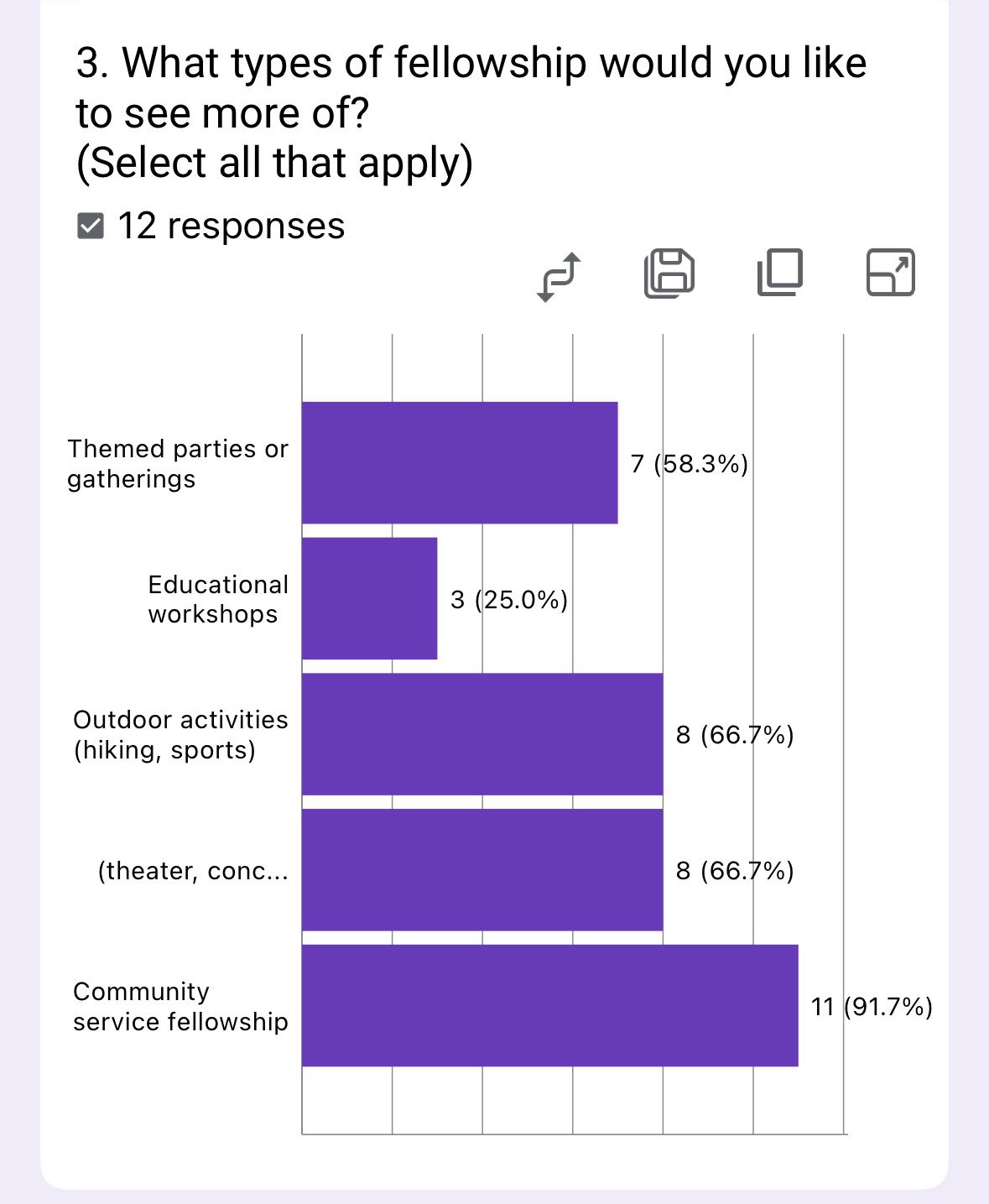 - Maintain the current fellowship offerings while exploring new connection-building formats. This balanced approach addresses all key areas while respecting the slightly higher preference for structured activities over pure social engagement.