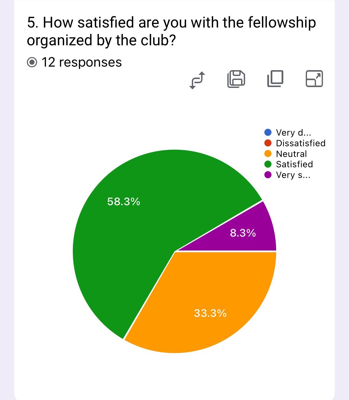 The survey shows moderate satisfaction levels: 50% are satisfied while only 8.3% are very satisfied, with a significant neutral group (33.3%) and a small dissatisfied segment (8.3%). This indicates most members are content but not enthusiastic, with room for improvement. Recommendations: