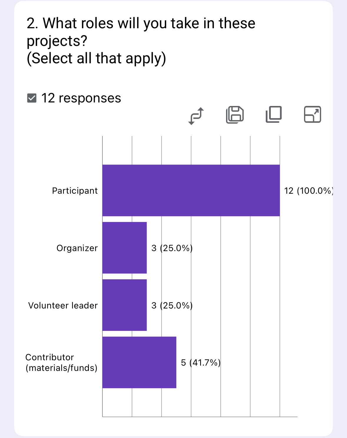 The survey reveals all members (100%) plan to contribute materials/funds, while 41.7% will serve as volunteer leaders and 25% each as organizers or participants. This shows a strong culture of giving but uneven leadership distribution.