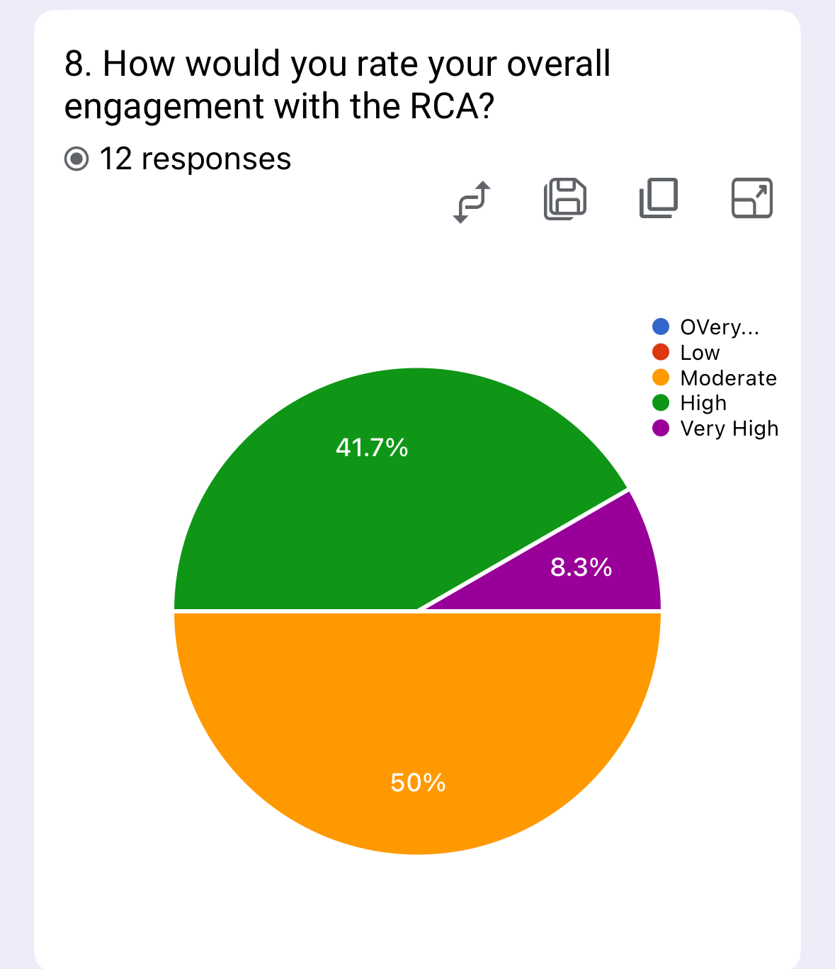 The survey shows a spectrum of engagement: 50% report moderate engagement, 41.7% high engagement, 8.3% very high engagement, and no members reporting very low engagement. This indicates successful engagement strategies with room to elevate more members to higher tiers. Recommendations: