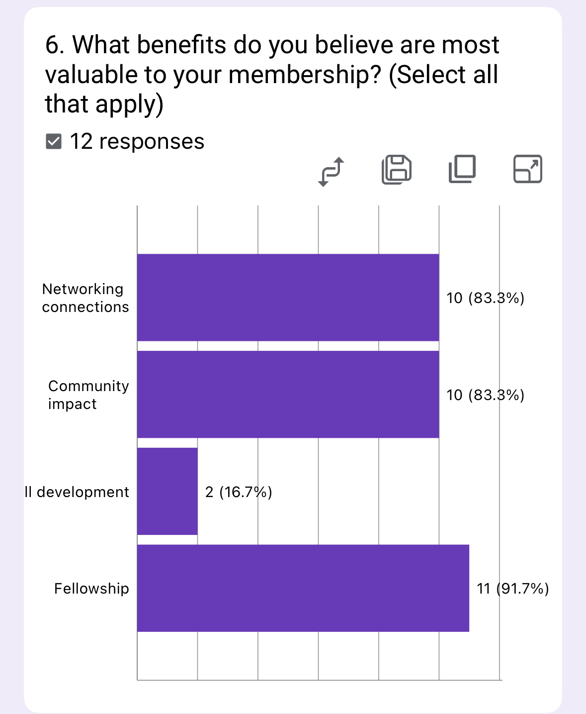 The survey reveals fellowship (91.7%) as the most valued benefit, closely followed by networking and community impact (83.3% each). Personal development trails significantly (16.7%). This indicates members prioritize social connections and collective impact over individual growth.