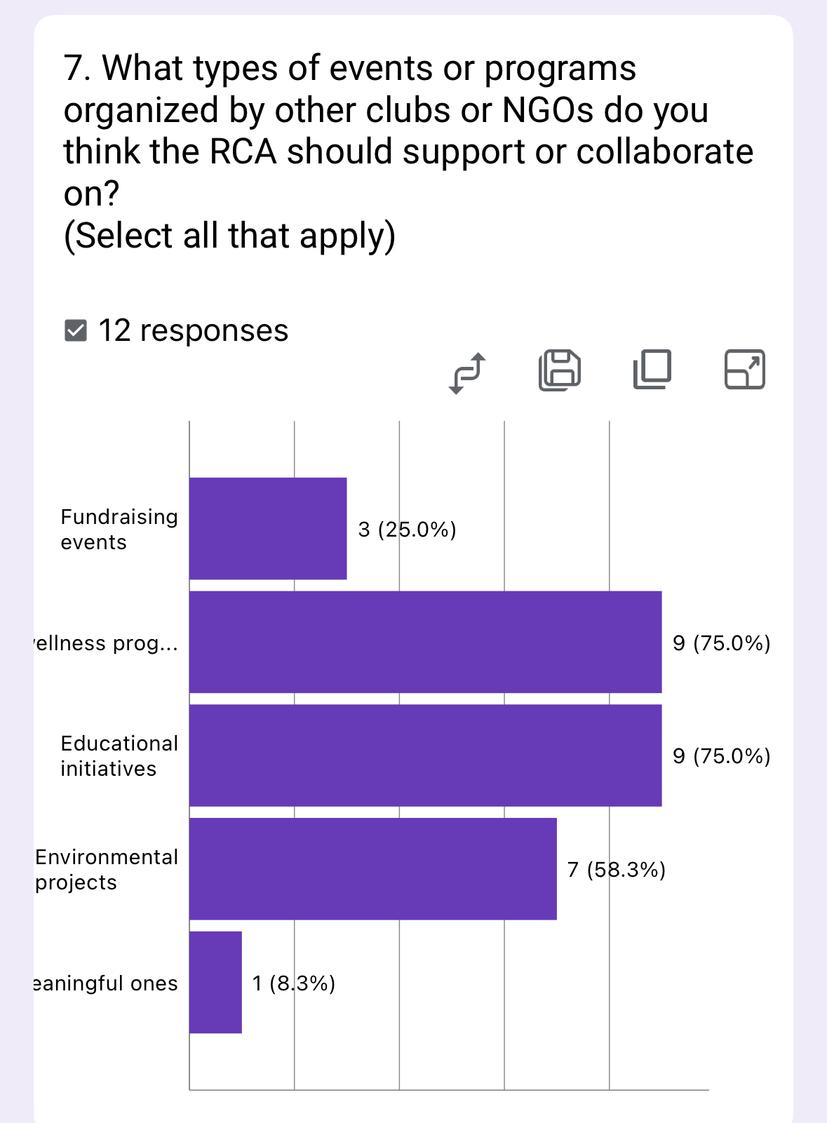 The survey reveals three priority areas for external partnerships: educational initiatives (75%), wellness programs (75%), and environmental projects (58.3%). Fundraising events (25%) and unspecified “meaningful ones” (8.3%) were less popular.