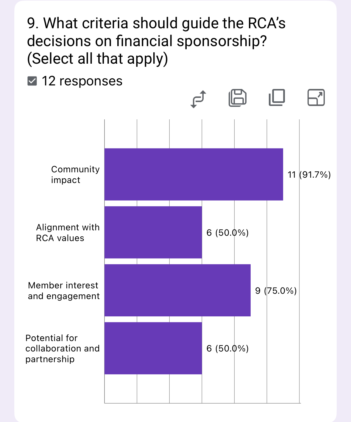 The survey highlights three key sponsorship criteria: alignment with RCA values (91.7%), member engagement (75%), and community impact (50%). Collaboration potential also scored 50%.