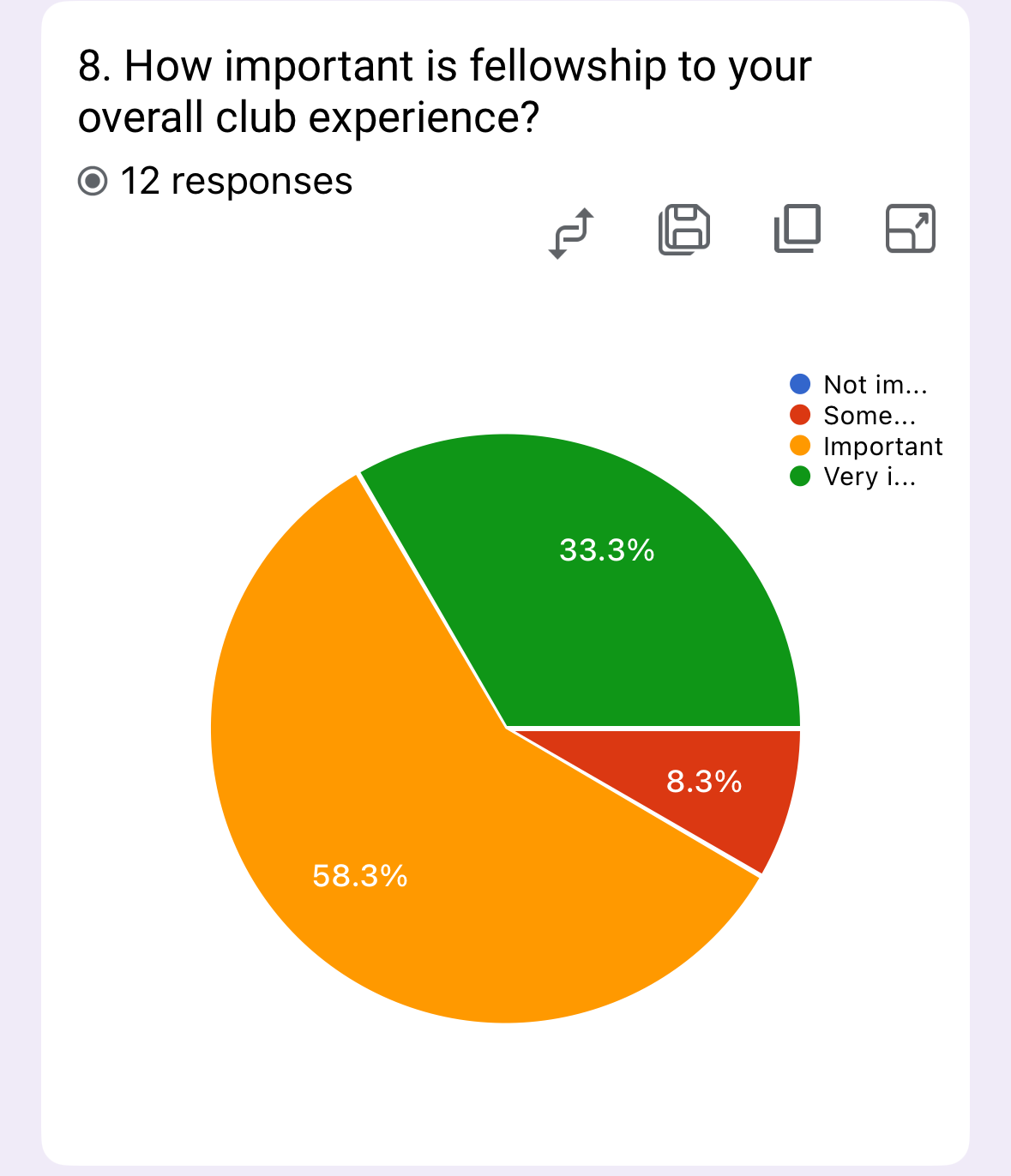 The survey reveals fellowship is highly valued in the club experience, with 58.3% rating it as “Very important” and 33.3% as “Important.” Only 8.3% consider it somewhat important. These results demonstrate fellowship is a critical component for the majority of members. Recommendations: