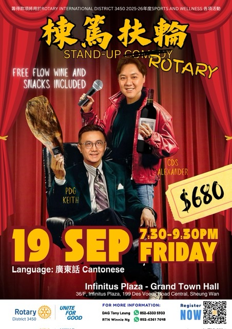 Join us for an evening of laughter, connection, and goodwill at our special Stand-Up Comedy event, where all proceeds will support the 2025-26年度 SPORTS AND WELLNESS 活動 (Sports and Wellness initiatives) of Rotary International District 3450.